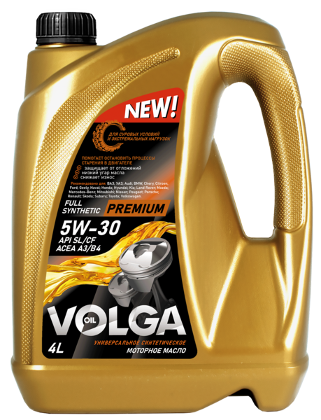 VOLGA OIL PREMIUM 5W-30 A3/B4, SL/CF - синтетическое моторное масло для бензиновых и дизельных двигателей легкового и легкого коммерческого транспорта. Изготовлено на основе синтетических базовых масел и высокотехнологичного пакета присадок.