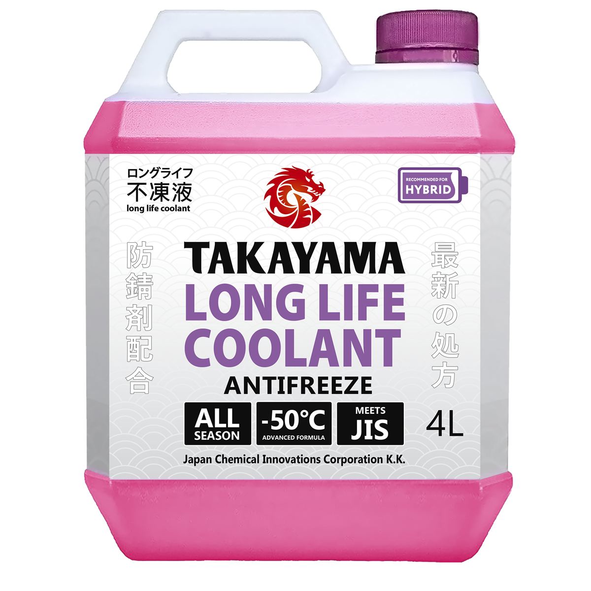Лобридная жидкость охлаждающая низкозамерзающая «TAKAYAMA LONG LIFE COOLANT HYBRID -50» на основе высокоочищенного этиленгликоля и специального пакета присадок, состоящего в том числе из ингибиторов коррозии на основе органических кислот и фосфатов (P-OAT — Phosphated -Organic Acid Technology). Не содержит в составе силикатов, нитратов, боратов и аминов. Температура застывания до -50 °C. Температура кипения 111 °С. Жидкость полностью готовая к применению.