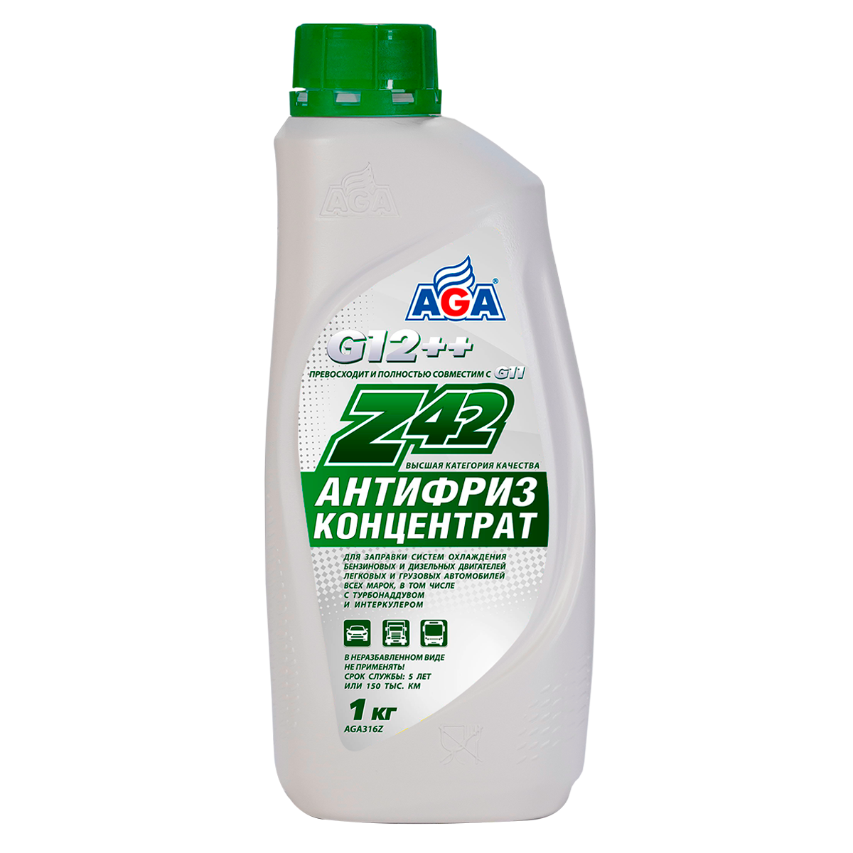 AGA-Z42 – универсальный антифриз высшей категории качества. Концентрат AGA-Z42 предназначен (после разбавления водой) для заправки систем охлаждения бензиновых и дизельных двигателей легковых и грузовых автомобилей всех марок, а также автобусов. Идеален для высокофорсированных двигателей, работающих в тяжелых динамических условиях с частым выходом на высокие обороты коленвала (более 4000 об/мин).