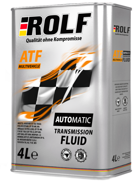 Rolf ATF Multivehicle - Высокоэффективная трансмиссионная жидкость для автоматических трансмиссий, изготовлена на основе синтетических базовых масел и многофункционального пакета присадок последнего поколения, что обеспечивает заданный коэффициент трения для передачи высокого крутящего момента, значительно снижает износ и предотвращает задиры. Обладает превосходными противоизносными и противозадирными свойствами, что обеспечивает защиту на весь срок службы масла. Обеспечивает оптимальный коэффициент трения, за счёт чего достигается плавность переключения передач. За счет применения синтетических базовых компонентов у жидкости высокий индекс вязкости, благодаря чему достигаются прекрасные низкотемпературные свойства.