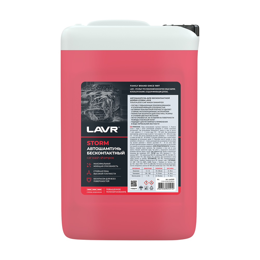Автошампунь для бесконтактной мойки STORM LAVR – профессиональное средство для очистки автомобиля. Концентрированный состав обладает усиленной моющей способностью и повышенным пенообразованием. Справляется со всеми видами загрязнений. Ингибитор коррозии в составе защищает от образования ржавчины.
