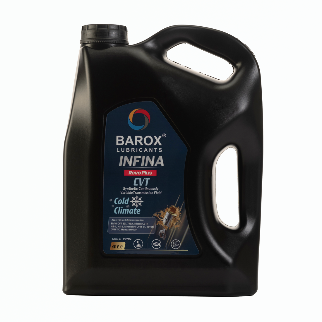 BAROX INFINA REVO PLUS CVT – Жидкость для бесступенчатых коробок передач (CVT). Изготовлена из синтетических базовых масел в сочетании с новейшими высокоэффективными присадками. Превосходный состав обеспечивает оптимальную стабильность к старению, отличную защиту от износа и хорошие фрикционные характеристики.