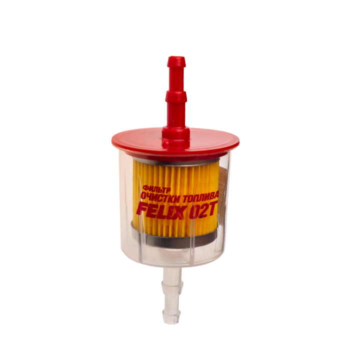 Фильтр топливный FELIX 02 T(50) состоит из гофрированного фильтровального материала, двух торцевых металлических крышек, прозрачного пластмассового корпуса, пластмассовой крышки с двумя штуцерами.