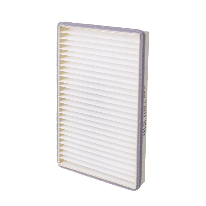 Фильтр салонный FELIX 1118 C состоит из: фильтровальный материал химволокно/плотность 150±5 г/м2 (цвет белый); количество гофр 40; лента каркасная 30 мм; клей-расплав; пенополиуретан; площадь фильтрации 304560 мм. кв.