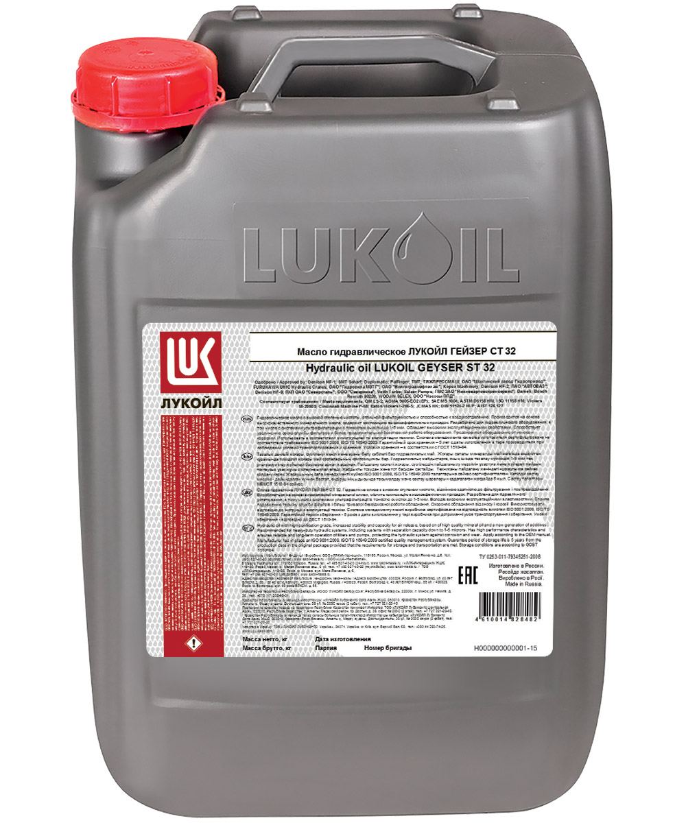 Лукойл ГЕЙЗЕР СТ 32 - Гидравлическое масло с высокой степенью чистоты, отличной фильтруемостью и хорошей способностью к воздухоотделению. Производится на высо-коиндексной минеральной базовой основе с пакетом высокоэффективных присадок. Способно работать в жестких условиях эксплуатации, предохра-няя оборудование от износа и коррозии. Обеспечивает увеличение срока службы фильтров и снижение эксплуатационных затрат, связанных с вынуж-денным простоем оборудования.