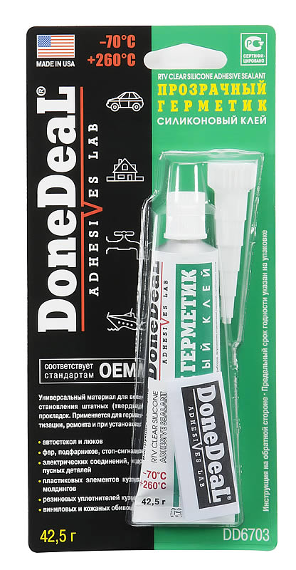 - Прозрачный, водонепроницаемый силиконовый клей-герметик широкого диапазона использования. Заполняет пустоты и неплотности. Используется для ремонта и герметизации автомобильных стекол, люков и осветительных приборов, внутренних отделочных элементов и приборных панелей.