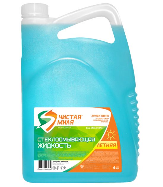 Стеклоомывающая жидкость летняя Чистая миля. Быстро и эффективно удаляет дорожную грязь, нефтяные и органические загрязнения, благодаря специальному составу, обладающему высокой моющей способностью.